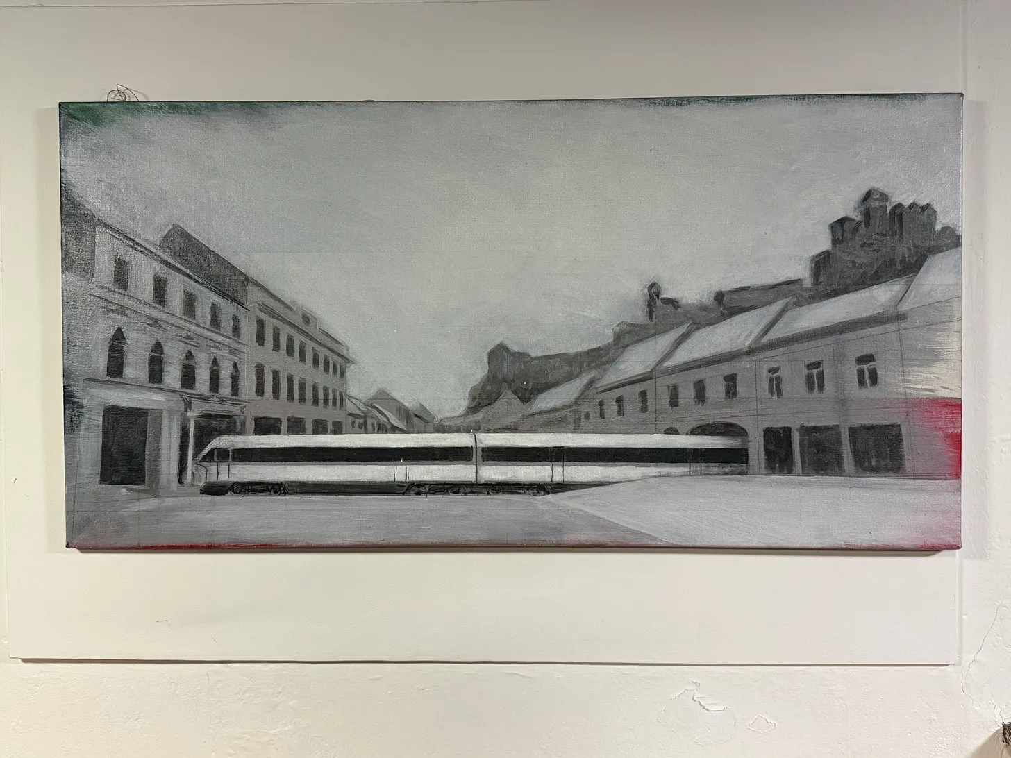 Back to the painting. It a singular point of view from the perspective of the artist, or some gazer, looking down the square. Mierovié, the square’s name, is a long, narrow, tube — hot dog! — shaped plaza, with nearly-ancient low-rise buildings ringing its edges. Its centre point is a Roman column, inscribed with some Latin that I don’t know what it means. I did, in the spring, meet with the local historian, but that conversation has slipped my mind. It’s a very pleasant square, utterly constructed out of cafes and terraces that offer everything from Instagram-worthy cheeseburgers to late night beers. But in the painting, Mierovié is punctured by… a high speed train, zipping through one building’s alleyway opening on the righthand side through another on its right. Why?! If the plaza is a hot dog, then imagine the train like a toothpick, piercing the wiener with the city fading into the distant haze.